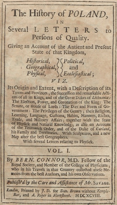 What does it all have to do with John III or his wife? It turns out, quite a lot, if we consider that authors of several accounts about the king himself and the Commonwealth under his rule most certainly plagiarized one another, of course without admitting to it. Zest to the whole story adds the fact that the same can be said also about two works written in England shortly before introduction of the new rules protecting authors against illegal use of their works. Meant are here “The History of Poland” by Bernard Connor and a report by Robert South entitled „An Account of his [South] Travels into Poland with the Earl of Rochester in the year 1674”. And it is quite tricky to determine who copied whom.