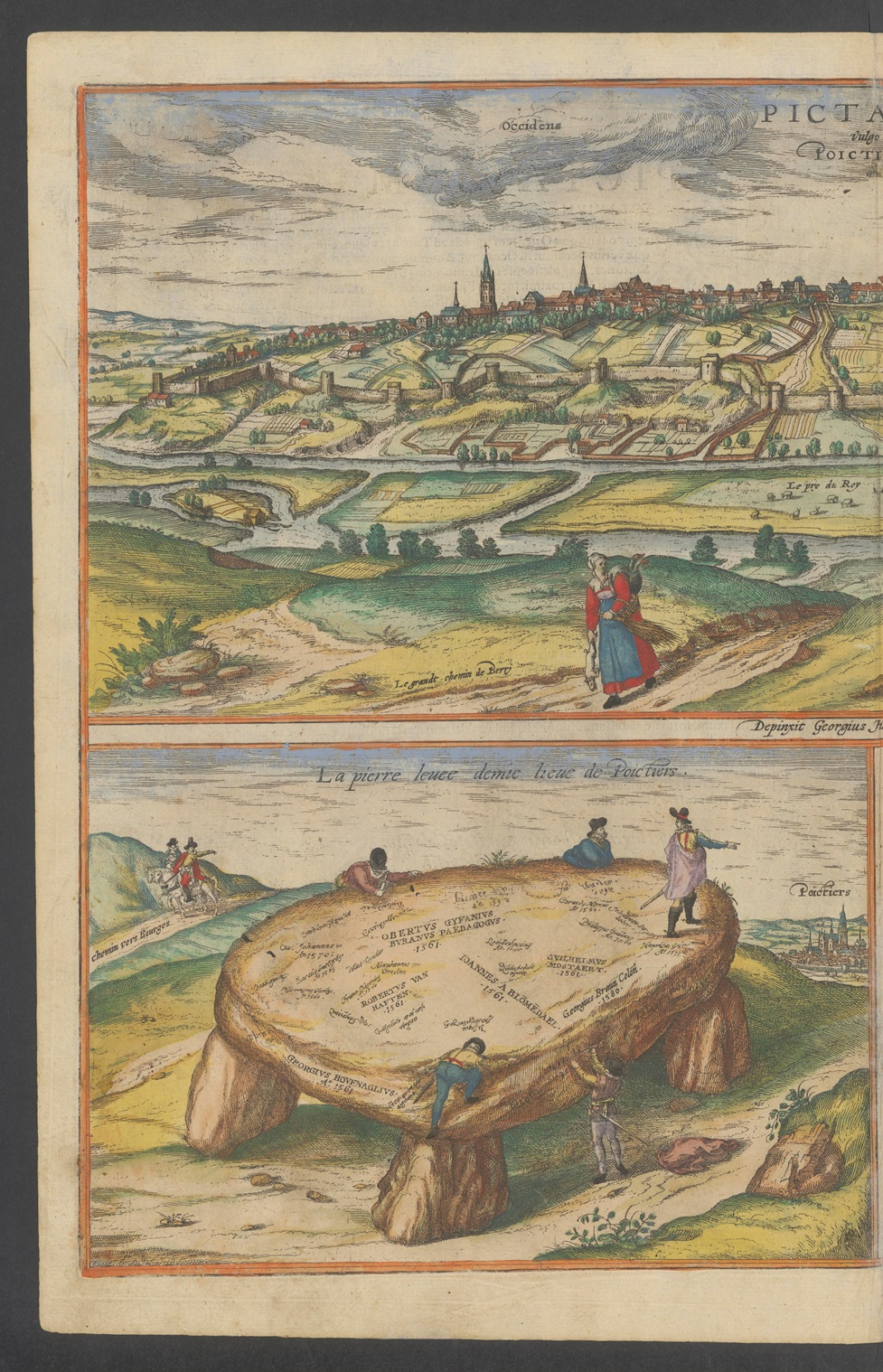 Zaczęło się od ilustracji autorstwa Jorisa Hoefnagela, który podczas podróży po Europie odwiedził w 1561 roku kamień w Poitiers. Przedstawił on na pierre levée liczne podpisy, których autorami mieliby być, poza nim samym, m.in. kartografowie Gerard Mercator, Philips Galle czy Abraham Ortelius, grafik Frans Hogenberg, wydawca map Georg Braun, czy artysta Jan Sadeler. Ilustracja Hoefnagela znalazła się następnie w słynnym atlasie Hogenberga i Brauna. Paul J. Smith konstatuje jednak, że przedstawiona scena wygląda na całkowicie nierealistyczną: