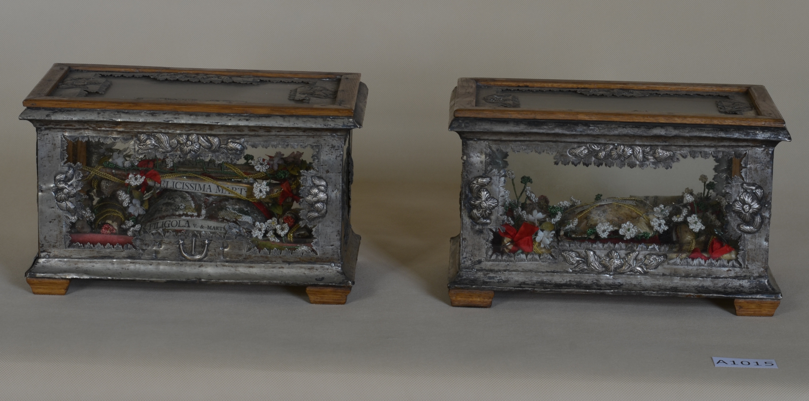Zabytek z klasztoru benedyktynek w Krzeszowie to para bardzo zbliżonych kształtem i dekoracją relikwiarzy w formie prostopadłościennych skrzynek. Wspierają się one na drewnianych, spłaszczonych nóżkach, a do krawędzi ich wieczek przybite są drewniane listewki (zarówno opisane elementy, jak i drewniane korpusy relikwiarzy, a także szyby są nowsze). Wszystkie cztery ścianki boczne i wieka relikwiarzy mają szyby oprawione w srebrne listwy, które zostały nałożone na drewniane korpusy skrzynek. Listwy te – częściowo gładkie, a na osiach dekorowane motywami kwiatów i liści – od strony szybek zdobione są fryzami z postrzępionych listków. Pośrodku dolnej części przedniej ścianki każdej skrzynki widoczne są herb Sas Daniłowiczów (bez tarczy) i – po bokach – litery odnoszące się do fundatorki relikwiarzy: „D[orota] M[agdalena] D[aniłowiczówna] | X[ieni] K[onwentu] L[wowskiego]”. Wewnątrz relikwiarzy, na tle czerwonej tkaniny gęsto rozmieszczone zostały partykuły świętych (ozdobione m.in. sztucznymi kwiatami). W relikwiarzu oznaczonym w Krzeszowie nowym numerem A1014 widoczne są banderole z nowszymi napisami (drukowanymi, różnej wielkości, częściowo przysłoniętymi): „S. FILIGOLA V. & MART:”, „S. FELICISSIMA MART.”, „S. JULIANI MART.”, „[…] PACIFI[ICAE] M.”, „S. BENIGNI MART.”, „S. HONORIJ MART.”, „S. MAGNI MART.”, “S. Vrbanae mart.” i ”S. Rud[…]”. W relikwiarzu oznaczonym nowym numerem A1015 widoczne są banderole z napisami (w większości nowymi, drukowanymi, niekiedy częściowo zakrytymi): „S. FAUSTI MART.”, S. GALLICANUS MART.”, „S. GENNADII MART.”, „S. FORTUNATA MART.”, S. CANDIDUS MART.”, „S. SERAPHIAE M.”. Oprócz tego na jednej starszej banderoli widoczny jest czerwony napis rękopiśmienny zapisany pismem gotyckim: „S. [S]ignctis D. ef[e]ns”.