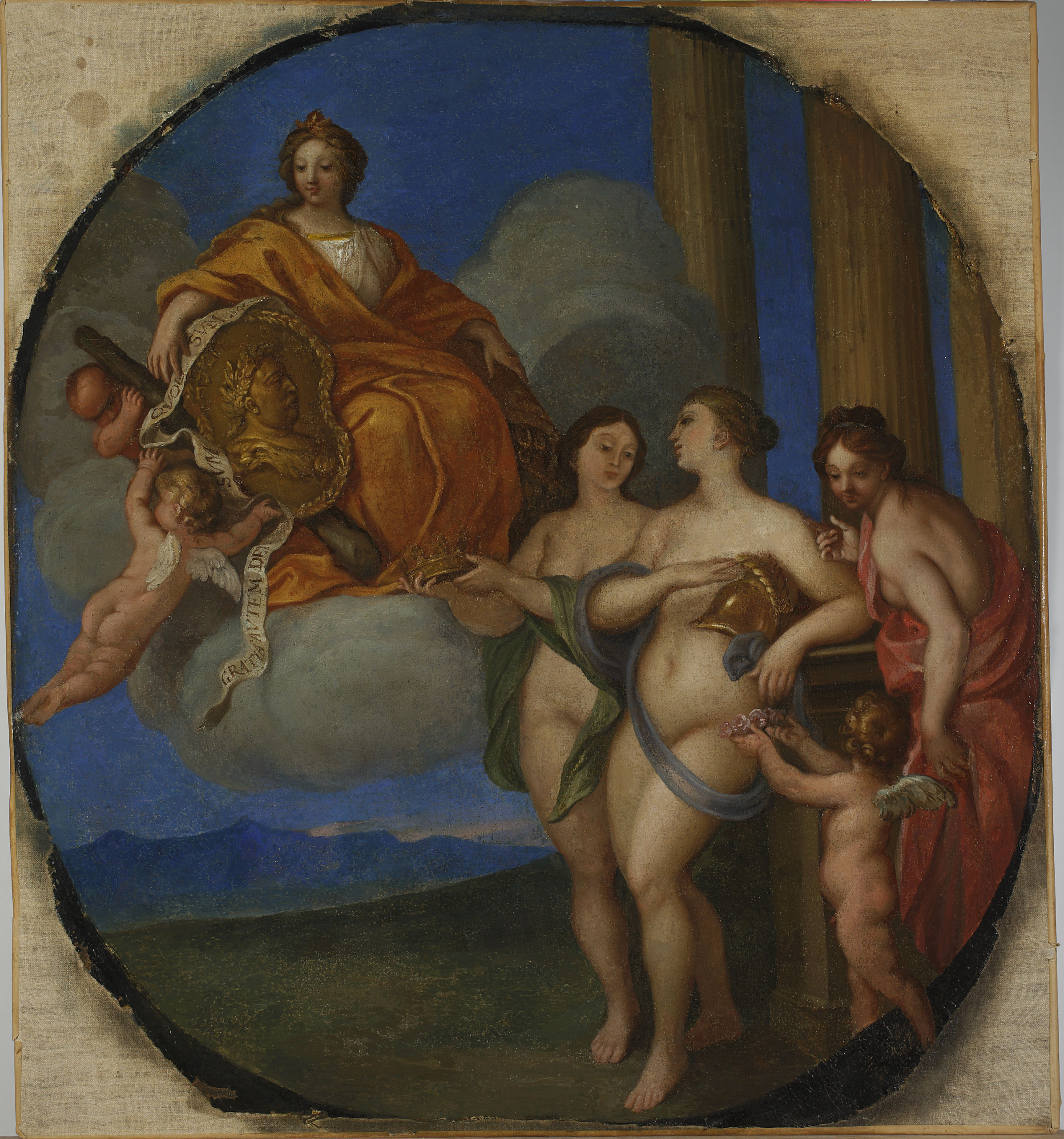 Na pierwszym planie putto oraz trzy alegoryczne postacie kobiece z atrybutami: koroną i hełmem. Na drugim planie postać kobieca siedząca na obłoku. Prawą rękę obejmuje kartusz z portretem Jana III Sobieskiego, w drugiej trzyma róg obfitości. Jedno z putt po prawej stronie postaci podtrzymuje kolumnę, na której opiera się kartusz, drugie trzyma wstęgę. Scena rozgrywa się na tle pejzażu ze wzgórzami, po prawej stornie za postaciami widoczne są trzy antyczne kolumny.